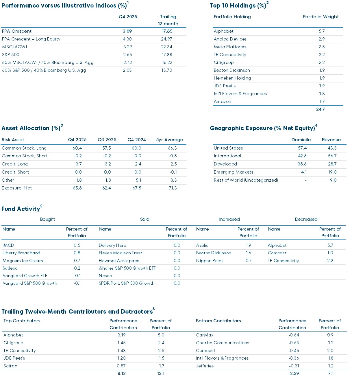 All data on this page as of December 31, 2025 and is for the FPA Crescent Fund – Institutional Class, unless otherwise indicated.