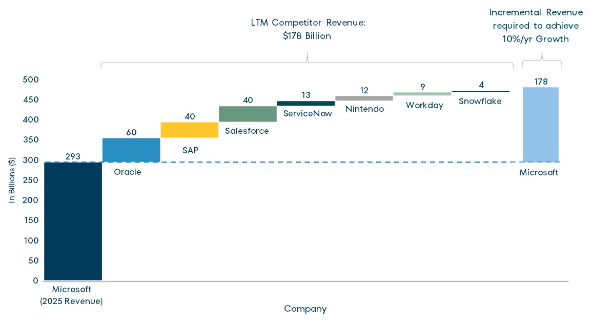 Stepping back, we will note that Microsoft generated $293bn of revenue over the last twelve months. If revenue were indeed to grow at 10% CAGR over the next five years, Microsoft would theoretically generate $472bn in revenue in 2030, an increase of $178bn. The bulls will say this is achievable based on growth in the core business and an expanding total available market (“TAM”). However, to put the $178bn increase into perspective, Microsoft would need to add revenue greater than the aggregate sales of ERP leaders Oracle and SAP, who generated ~$100bn in combined sales over the past twelve months. The bulls may say that our thinking is too narrow; vibe coding will also allow Microsoft to serve as the foundation or platform upon which corporations will create low-cost alternative solutions for CRM solutions (Salesforce: $40bn revenue), HR software (Workday: $9bn revenue), and new database products (Snowflake: $4.4bn revenue). Moreover, as the bulls believe, from a horizontal perspective, agentic AI will enable Microsoft to offer services to automate and manage digital workflows (ServiceNow: $12bn revenue) across industries. If that was not enough, the bulls will remind us that Microsoft has a consumer gaming franchise in Xbox that will grow over time (Nintendo: $12bn revenue).