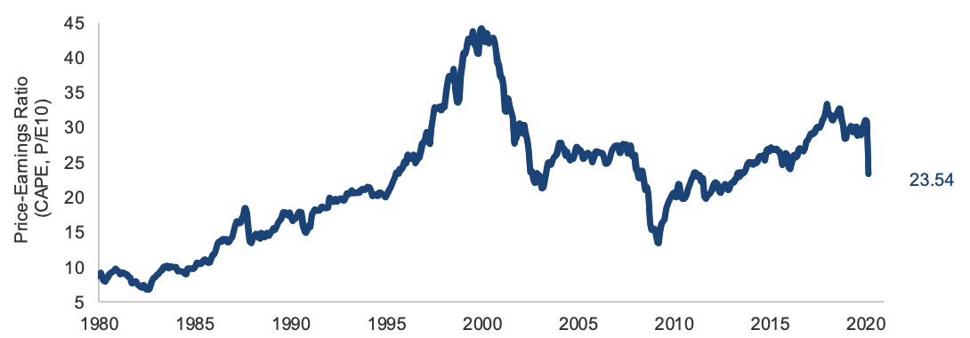 - The S&P 500 is now at a ~23x Shiller P/E, as of March 16, 2020