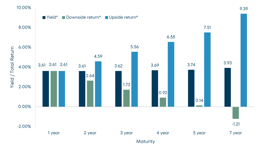 As of September 30, 2025. Source: Bloomberg. ^Yield-to-maturity is the annualized total return anticipated on a bond if the bond is held until it matures and assumes all payments are made as scheduled and are reinvested at the same yield. ^* Downside return estimates the 12-month total return assuming yields increase by 100 bps over 12 months. Upside return estimates the 12-month total return assuming yields decline by 100 bps over 12 months. Return estimates assume gradual change in yield over 12 months. The hypothetical stress test data provided herein is for illustrative and informational purposes only and is intended to demonstrate the mathematical impact of a hypothetical change in Treasury yields on Treasury returns. No representation is being made that any account, product or strategy will or is likely to achieve profits, losses, or results similar to those shown. Hypothetical results do not reflect trading in actual accounts, and does not reflect the impact that all economic, market or other factors may have on the management of the account. Hypothetical results have certain inherent limitations. There are frequently sharp differences between simulated results and the actual results subsequently achieved by any particular account, product or strategy. Past performance is no guarantee, nor is it indicative, of future results. Please refer to the back of the commentary for important disclosures.
