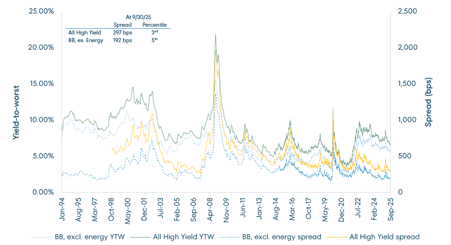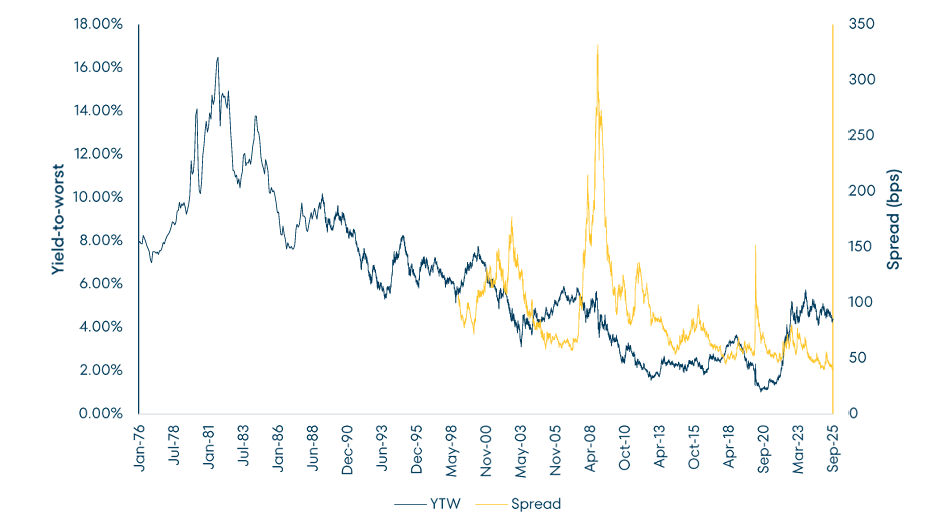 Source: Bloomberg. As of September 30, 2025. YTW is Yield-to-Worst. Spread reflects the quoted spread of a bond that is relative to the security off which it is priced, typically an on the run treasury. Past performance is no guarantee, nor is it indicative, of future results. Please refer to the end of the commentary for Important Disclosures and Index definitions.