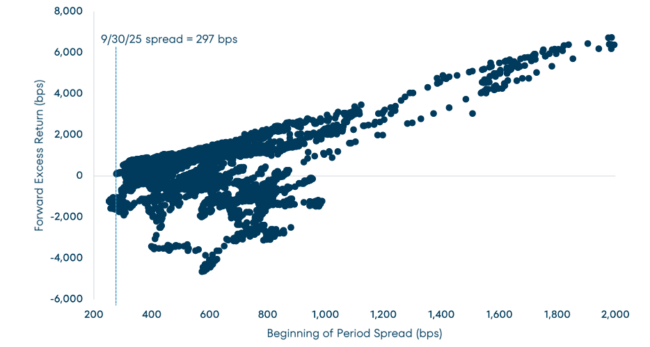 Source: Bloomberg; As of September 30, 2025. Chart covers the period 11/27/98 to 9/30/24 and shows the forward one-year return on the Bloomberg U.S. Corporate High Yield Index in excess of the return on similar duration Treasuries versus the starting spread on that high yield index at the start of each one-year period. Past performance is no guarantee, nor is it indicative, of future results.