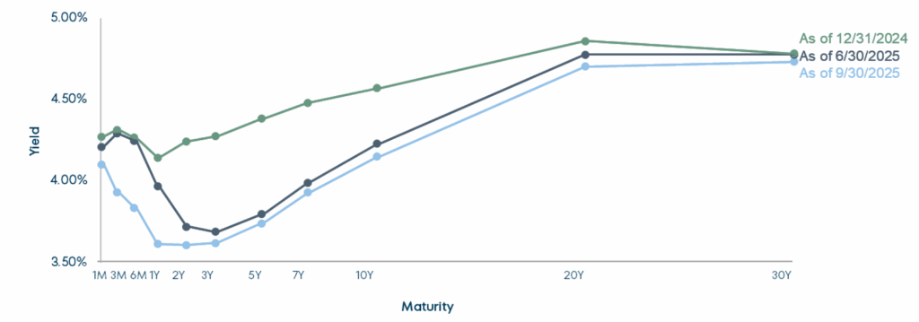 It is a good thing that we do not try to make money by betting on the direction of interest rates. A task that we had already viewed as nearly impossible to accomplish with conviction has become significantly more difficult in recent months. As of September 30, the market was expecting an additional 25–50 bps of rate cuts by the end of 2025. However, there is uncertainty about the timing and magnitude of those cuts because the Federal Reserve is wrestling with the conflicting objectives of keeping a lid on inflation – which is still running above the Fed’s 2% target – and guiding the economy toward full employment. If the choice were between managing inflation or employment, the path of rates would still be uncertain but less so. As it stands, the Federal Reserve must choose between easing too early and risking higher inflation or easing too late (or not at all) and risking increased unemployment and weaker growth. Adding to this challenge, the Federal Reserve is also wrestling with overt political pressure on monetary policy. Finally, the federal government is shut down and not producing data. If one assumes that the government produces good quality, reliable data, then it is difficult for central bankers (and, in turn, market forecasters) to know which way interest rates should move when data are not available.