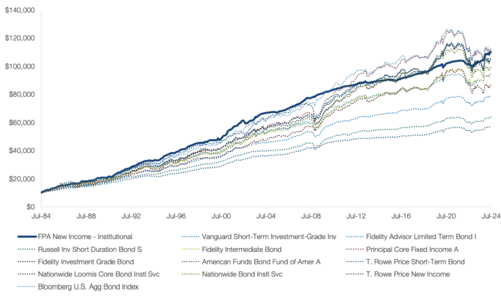 Source: Morningstar. Data shown for the period July 31, 1984 through June 30, 2024. The chart illustrates the performance of a hypothetical $10,000 investment made in the funds noted since inception of FPA New Income on July 11, 1984. Fund returns shown assume reinvestment of distributions and do not reflect the deduction of taxes that a shareholder would pay on fund distributions or the redemption of fund shares, which would lower these figures. This chart is not intended to imply any future performance of the Fund or of any other fund noted.