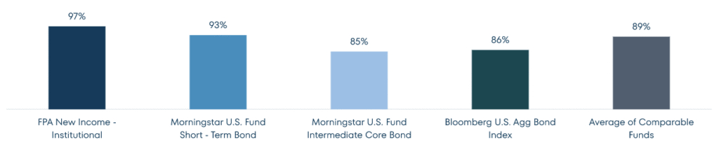 5 Source: Morningstar Direct. The chart illustrates the percent of 12-month rolling periods that resulted in positive average performance for the FPA New Income Fund – Institutional from August 1, 1984 through June 30, 2024 compared to the Morningstar U.S. Fund Short-Term Bond, Morningstar U.S. Fund Intermediate Core Bond, Bloomberg U.S. Agg Bond Index, and the average returns of the 11 Morningstar Short-Term and Intermediate Core Bonds with at least 40 years of history (i.e., “Comparable Funds”).
