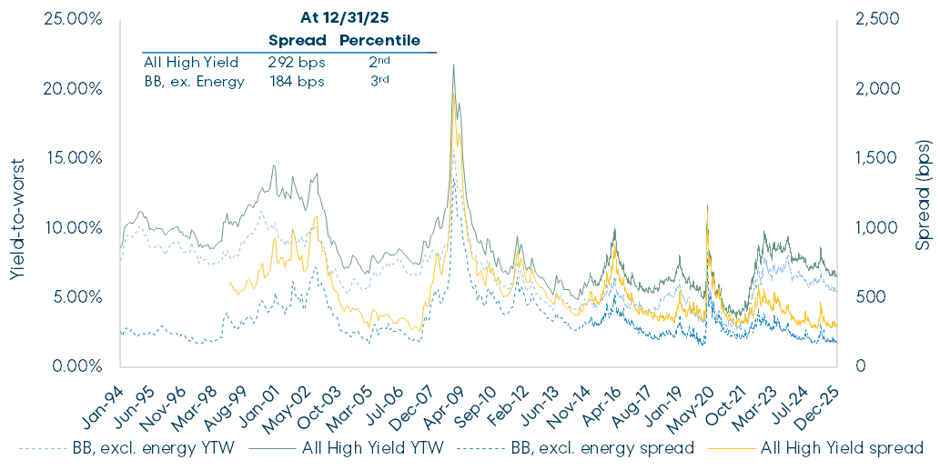 Source: Bloomberg. As of December 31, 2025. YTW is Yield-to-Worst. Spread reflects the quoted spread of a bond that is relative to the security off which it is priced, typically an on the run treasury. Past performance is no guarantee, nor is it indicative, of future results. Please refer to the end of the commentary for Important Disclosures and Index definitions.