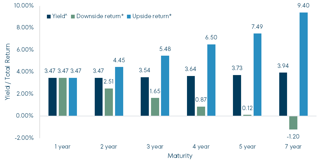 As of December 31, 2025. Source: Bloomberg. ¹ Yield-to-maturity is the annualized total return anticipated on a bond if the bond is held until it matures and assumes all payments are made as scheduled and are reinvested at the same yield. ² Downside return estimates the 12-month total return assuming yields increase by 100 bps over 12 months. Upside return estimates the 12-month total return assuming yields decline by 100 bps over 12 months. Return estimates assume gradual change in yield over 12 months. The hypothetical stress test data provided herein is for illustrative and informational purposes only and is intended to demonstrate the mathematical impact of a hypothetical change in Treasury yields on Treasury returns. This data is not, and is not intended to be representative of the Fund’s returns. No representation is being made that any account, product or strategy will or is likely to achieve profits, losses, or results similar to those shown. Past performance is no guarantee, nor is it indicative, of future results. Please refer to the back of the commentary for important disclosures.