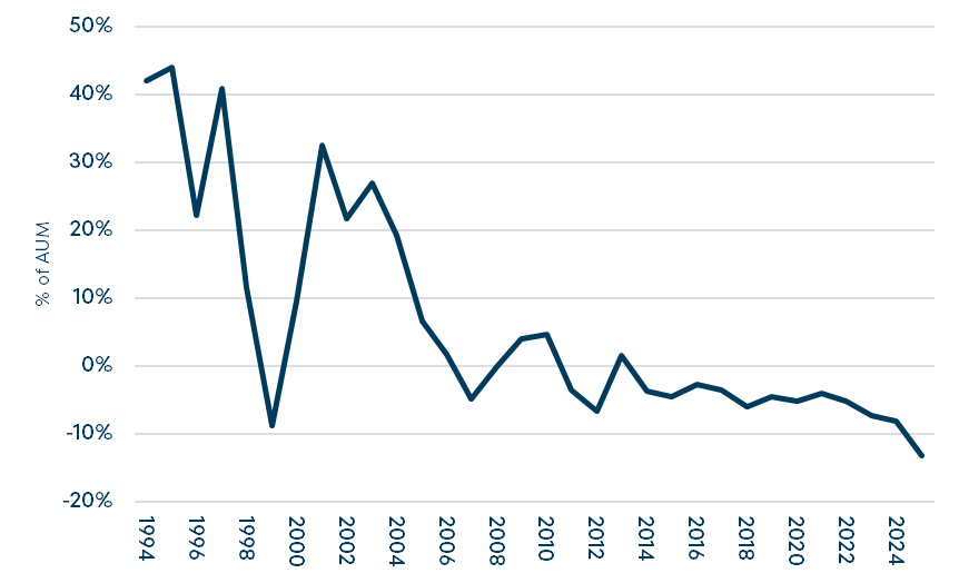 3) Small-caps have been disdained and overlooked – and this improves our opportunity set. Statistically defining our opportunity set is difficult. We deal in the particularities of individual companies which requires context, adjustment, and nuance. We know that outflows from actively managed small value have accelerated and reached -13% of assets under management in 2025. And while harder to measure, capital has also withdrawn from the single manager long short community that tended to look at small companies with a one to three year timeframe.7