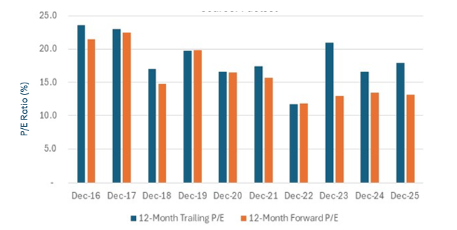 - ServisFirst Bancshares (SFBS) is a conservatively run lending franchise helmed by Tom Broughton. Tom hires local bankers but doesn’t build branches – this allows for best-in-class efficiency metrics while maintaining a strong and conservative lending culture. Return on equity (ROE) and average earnings per share growth were near 20% for the 10 years through 2024 – very attractive for a conservative, plain vanilla commercial lender.26 We think that SFBS trailed the regional bank indices in 2025 because of its concentrated exposure to South-Eastern real estate, a large Q3 non-accrual for which the bank obtained additional collateral and disappointing Q3 loan growth.27 We have followed the company for years and are extremely comfortable continuing to hold SFBS in our top 10 holdings.