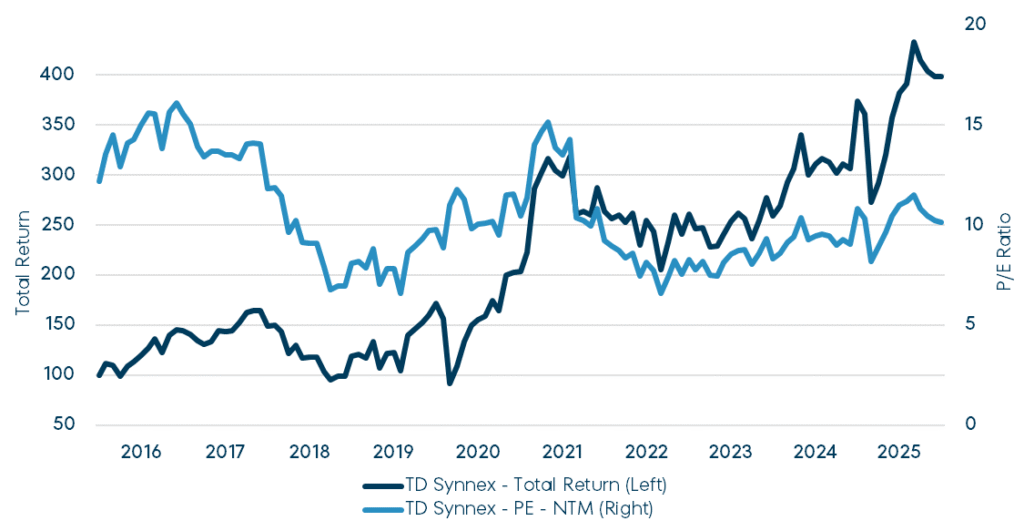 TD Synnex (SNX) is the world’s largest IT distributor.14 The company was formed by the merger of Tech Data and Synnex in 2021 – we first bought TD in 2010 (it was taken private in 2020) and SNX in 2012. 20 years ago, IT distribution meant delivering PCs, servers and networking equipment from warehouses to customers. But SNX used its position as a middleman to add value to both sides of the equation, acting as an outsourced sales force for its OEM suppliers while providing bundling, consultation and other value-added services to its customers. SNX evolved with the times selling increasing amounts of software, security, cloud and now AI products. Still, this is a relatively old school, low margin / high volume business with a large element of working capital management.