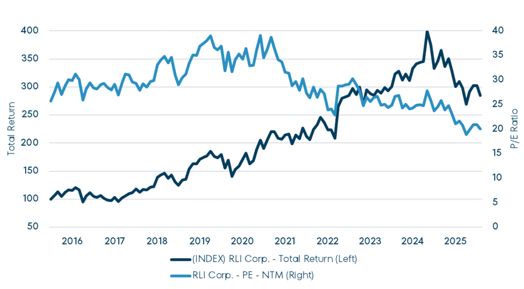 - RLI Corp (RLI) is a specialty property and casualty insurer. The company is extremely selective in writing business. Its diversified lines include niche-y areas such as public and school busses, Hawaii homeowners, and surety. RLI’s unique culture, incentive structures and willingness to walk away from unprofitable business have historically led to exceptional financial performance. From 2015 through 2024, the company’s combined ratio has averaged 89.3% and its ROE has averaged 16.6% despite being weighed down by excess capital.25 We have owned RLI since 2011 and the stock usually commands a premium valuation – we are pleased to be able to add to our position at roughly 20x this year’s earnings.