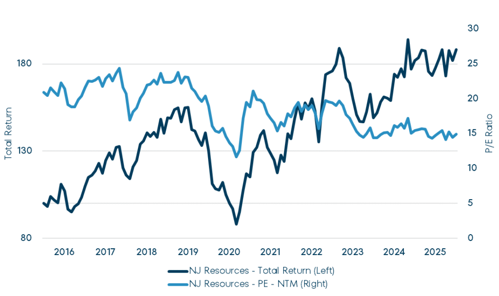 Incredibly, the Fund has owned shares in NJR since inception in 2002. And like SNX and RLI, the company has grown and evolved but hasn’t fundamentally changed over the last ten years. Yet its forward P/E multiple has declined from 20x to 15x (blue line below). We believe this is another case of an overlooked, “boring” stock and think shares in NJR are attractive.