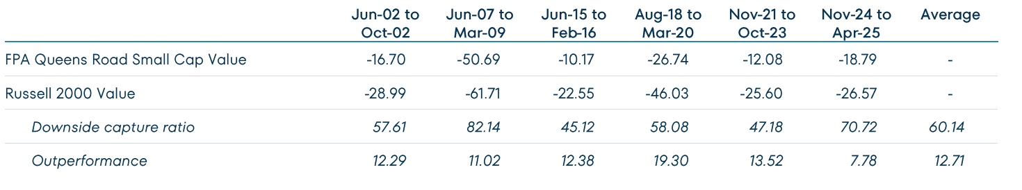 1 As of September 30, 2025. Source: Morningstar Direct, FPA. Data shown for the FPA Queens Road Small Cap Value Fund – Investor Class (“Fund”). Inception of the Fund was June 13, 2002. The periods referenced above reflect Russell 2000 Value drawdowns 20% or greater and are calculated from that index’s peak and trough dates, (i.e., 6/28/2002-10/9/2002, 6/4/2007-3/9/2009, 6/23/2015-2/11/2016, 8/22/2018-3/23/2020, 11/8/2021-10/27/2023, 11/25/2024-4/8/2025). Please see page 1 for net performance of the Fund since inception. Please also see the end of this commentary for Important Disclosures and Definitions of Key Terms.