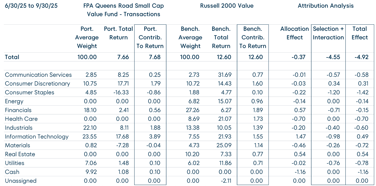 Queens Road Small Cap Value Fund 2025 Q3 Attribution