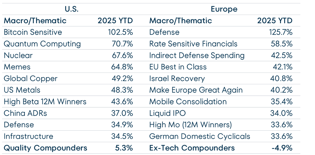 The strategists at Goldman track a collection of investment themes. A collection of junkier themes has trounced “Quality Compounders” since Liberation Day in early April (borrowed from the Fiduciary Management Inc. Q3 letter).7 This corroborates what we are seeing from the bottom up where, Q3 in particular, felt like a junky rally.