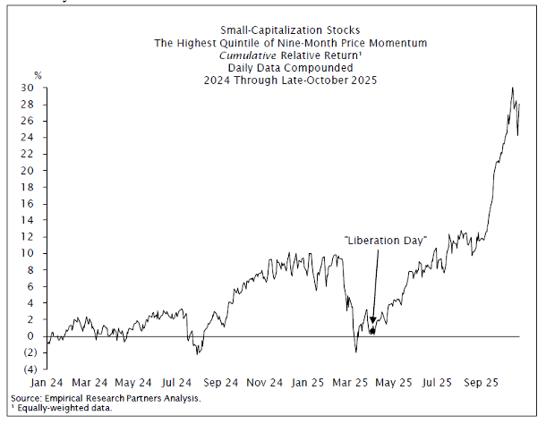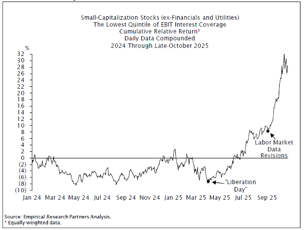 According to the strategists at Empirical Research Partners, small cap momentum stocks and small cap low-interest-coverage stocks have been exceptionally strong since “Liberation Day” in early April. In each case, relative performance really took off in Q3.6
