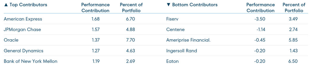 Our top performers on a twelve month basis include three financials, American Express, JP Morgan Chase and Bank of New York Mellon, which benefitted from a resilient economy, favorable credit conditions and strength among high end consumers. Oracle sells cloud compute and databases and has been an AI winner. General Dynamics is a defense prime contractor and is benefitting from higher expected defense budgets.