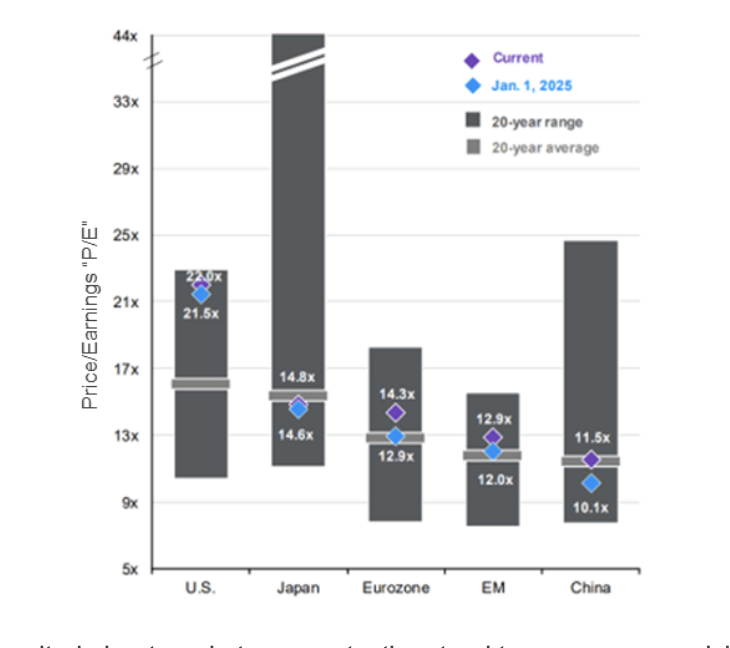 ⁹ As of June 30, 2025. Source: J.P. Morgan Asset Management Guide to the Markets. Forward Price to Earnings is a version of the ratio of price-to-earnings (P/E) that uses forecasted earnings for the P/E calculation. The Fund does not include outperformance of any index or benchmark in its investment objectives. Please refer to the Important Disclosures for definitions of key terms and representative indices used for each geographic market shown in the table.