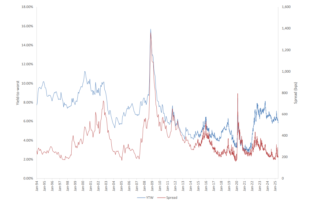 ¹⁵ Source: Bloomberg. As of June 30, 2025. YTW is Yield-to-Worst. Spread reflects the quoted spread of a bond that is relative to the security off which it is priced, typically an on-the-run Treasury. Please see Important Disclosures for definitions of key terms.