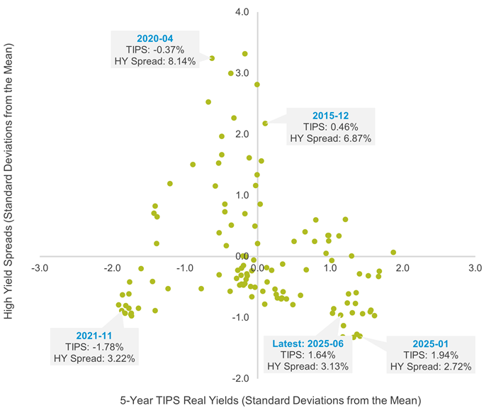TIPS 5-Year vs High Yield Bond Spreads (July 2015 to June 2025)