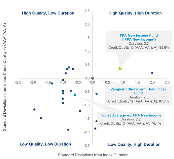 Contrast this positioning with FPA New Income – it is one of only two funds in the upper right quadrant, meaning it has a higher credit profile AND higher duration than the index.