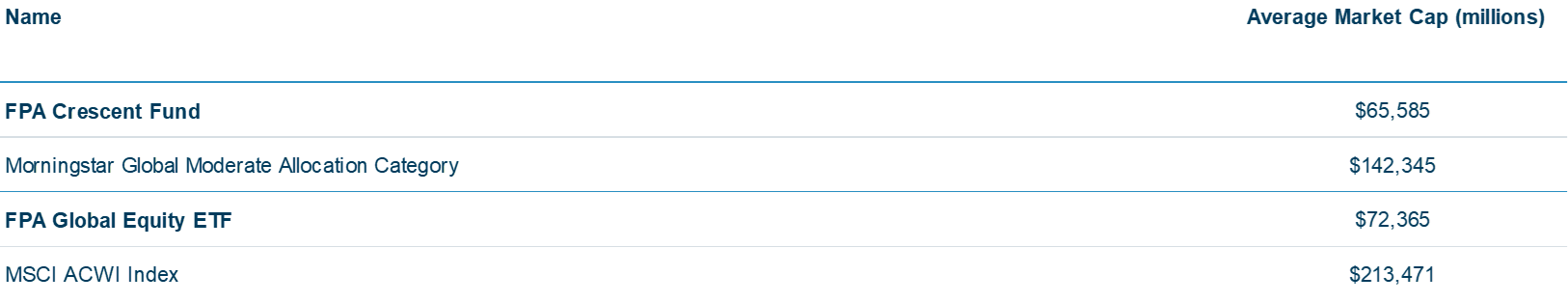 For perspective, the FPA Crescent Fund’s weighted average market capitalization is less than half that of its Morningstar Global Moderate Allocation Category peer group, and the FPA Global Equity ETF’s is nearly one-third that of the MSCI All Country World Index.
